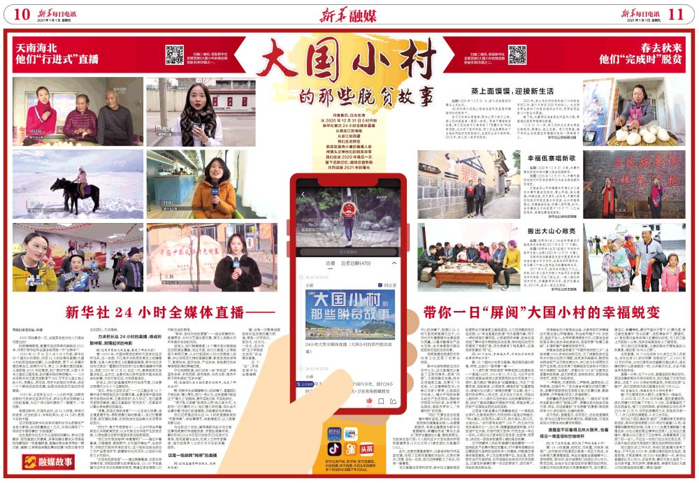 2020年12月31日0點0分0秒起,新華社26個國內(nèi)分社聯(lián)動,開啟24小時全媒體直播《大國小村的那些脫貧故事》。從白雪皚皚、零下40多攝氏度的黑龍江,到椰風(fēng)習(xí)習(xí)、零上10多攝氏度的海南,從海拔超4000米的高原,到廣袤的平原,從數(shù)十萬米之遙的衛(wèi)星視角,到纖毫畢現(xiàn)的特寫鏡頭……100余名新華社記者走進(jìn)散落于960萬平方公里土地上的小村,用鏡頭、用對話、用老鄉(xiāng)的皺紋與笑容,講述一個個鮮活的脫貧故事,繪就決戰(zhàn)脫貧攻堅的恢宏畫卷。