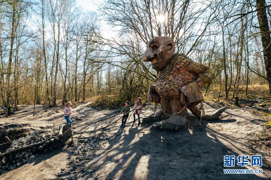 3月20日,孩子們?cè)诒壤麜r(shí)博姆市的德舒爾森林公園和一座“巨人”雕塑“玩?!?。新華社記者 張鋮 攝
