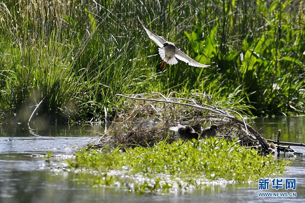 初夏,紅腳鷸在位于西藏拉薩的拉魯濕地國家級(jí)自然保護(hù)區(qū)內(nèi)起舞覓食。