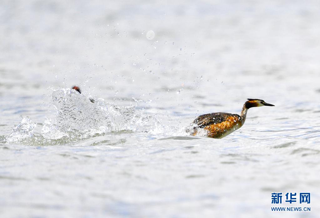 6月14日在拉魯濕地拍攝的鳳頭??。夏日里,鳳頭??和小??在西藏拉薩拉魯濕地國家級自然保護區(qū)水面上嬉戲。新華社記者 張汝鋒 攝
