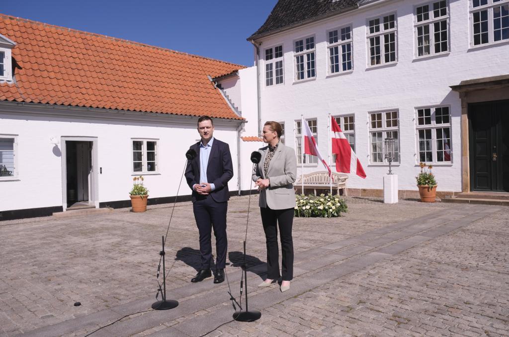2025年4月27日,在丹麦哥本哈根附近的马林堡,丹麦首相弗雷泽里克森(右)与格陵兰岛自治政府总理延斯-弗雷德里克·尼尔森共同会见记者。新华社记者张玉亮摄