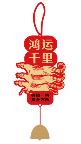 铃铛挂件中的图案取自《中国纹样全集》战国·秦·汉卷中的“汉代石刻翼马纹”,此马生有双翼,乃天界神骏,象征速度与超越,能为您驮来天赐鸿运。