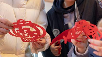 2月3日,马来西亚吉隆坡天后宫,游客与龙形彩灯装置合影。