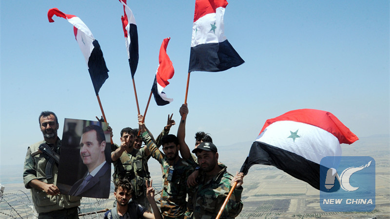 Syrian soldiers hold Syrian flags on the Tal al-Harrah in the northwestern countryside of Daraa Province, Syria, July 19, 2018. (Xinhua)