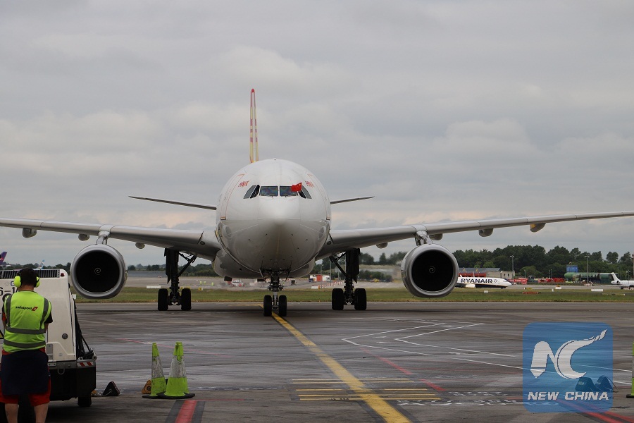 An Airbus A330 aircraft of China's Hainan Airlines is seen at Dublin Airport in Dublin, Ireland, June 12, 2018. The direct flight between Dublin and Beijing, capital of China, was launched here as the Airbus A330 aircraft of Hainan Airlines departed Dublin Airport. (Xinhua)