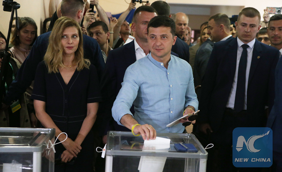 Ukrainian President Volodymyr Zelensky casts his ballot next to his wife Olena (L) at a polling station in Kiev, Ukraine, on July 21, 2019. (Xinhua/Sergey)