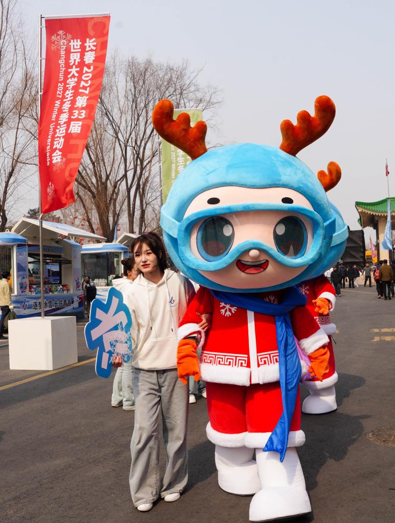 The mascots "Ji Bing" and "Ji Xue" are seen on parade in Changchun, northeast China's Jilin Province, March 21, 2026. To mark 300 days countdown to Changchun 2027 Winter Universiade, an unveiling ceremony of the games' emblem, slogan and mascots was held in Changchun on Saturday. (Xinhua/Zhang Nan)