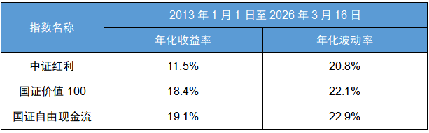 这三只指数因为选股票的思路不一样,表现也各有特点,特别好理解。中证红利指数主要看分红高低来选股票,防守性很强,涨跌波动更小,2013年以来年化收益率超过10%;国证自由现金流指数更看重公司手里的闲钱多少,上涨潜力更大,所以它的年化收益率在三只里最高,达到19.1%,不过波动也会稍微大一点;国证价值100指数则比较均衡,既看分红、也看赚钱能力和现金流,历史收益和波动都很稳。