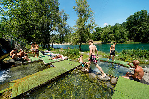 人们在意大利米兰附近的水边戏水消暑