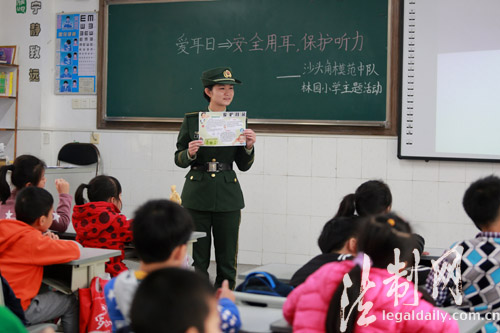 圖為邊防官兵為小學(xué)生們介紹愛護(hù)耳朵的知識