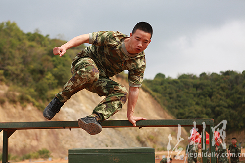 圖為大隊官兵正在快速進行障礙跑訓練