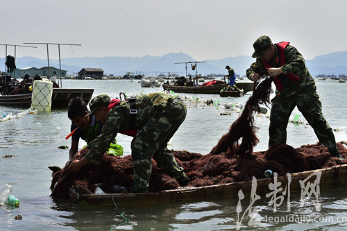 圖為在福建省寧德市蕉城區(qū)三都澳養(yǎng)殖區(qū),邊防官兵幫助漁民搶收龍須菜