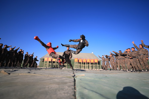 ????武警新疆總隊(duì)某機(jī)動(dòng)支隊(duì)特戰(zhàn)一中隊(duì)組織官兵開展搏擊訓(xùn)練(10月31日攝)。新華社發(fā)(張文 攝)
