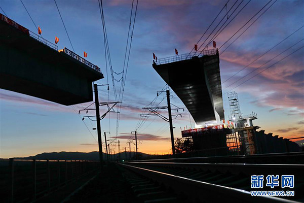 河北省懷來(lái)縣境內(nèi)的新建京張高鐵跨大秦鐵路線(xiàn)土木特大橋連續(xù)梁在轉(zhuǎn)體中(9月17日攝)。新華社記者 楊世堯 攝