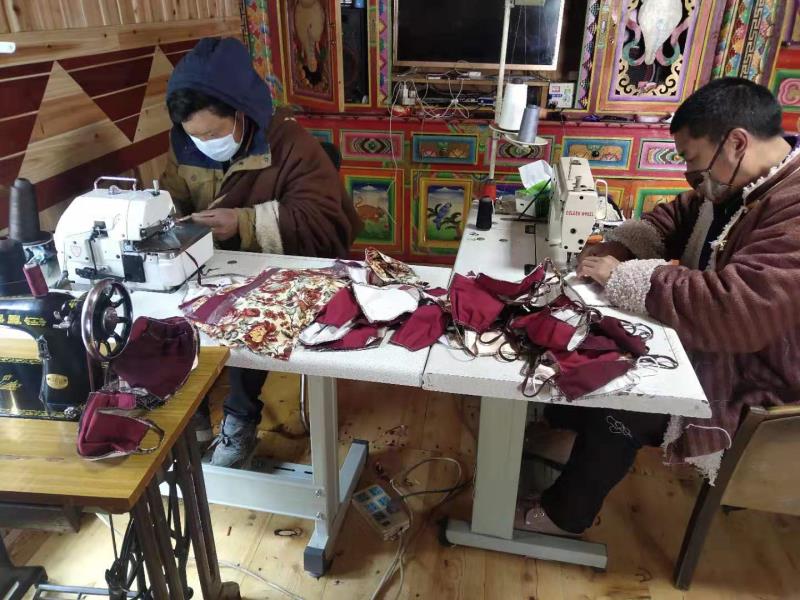 2月5日,四川省金川縣毛日鄉(xiāng)熱它村活動(dòng)室里一片忙碌景象,紉、剪布料、消毒......二十幾個(gè)村民正在有序地縫制口罩。