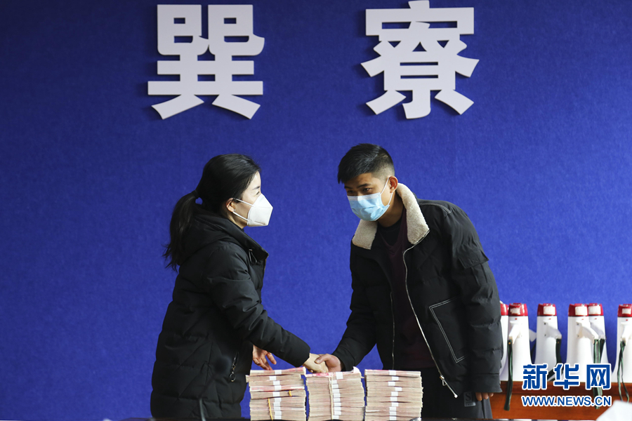 1月28日,90后退役軍人蘇培賓(右)向廣東惠東巽寮管委會捐款30萬元助力家鄉(xiāng)疫情防控。 新華社發(fā)