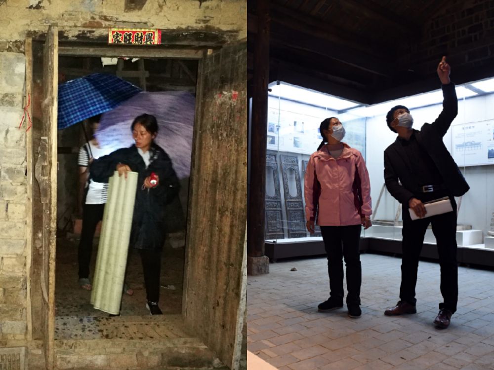 ?。ㄗ髨D:2017年7月的一場大暴雨中,大灣村第一書記余靜轉移危房中群眾,新華社記者陳諾攝;右圖:2020年3月19日,大灣村在建農(nóng)俗博物館內(nèi),余靜(左)和施工人員交流。新華社發(fā)周牧攝)