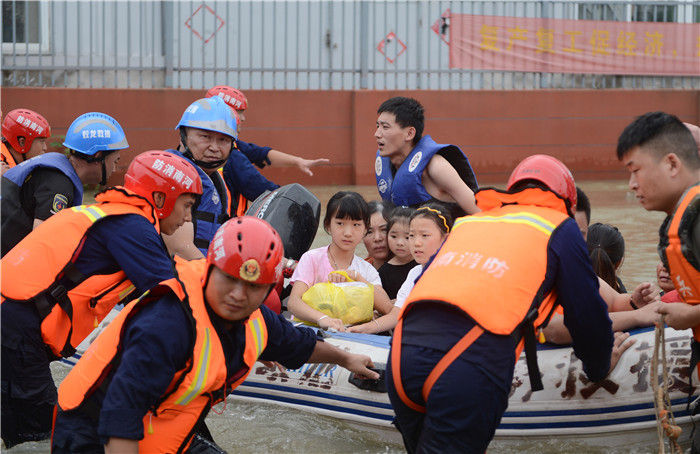 7月20日,安徽省六安市裕安區(qū)固鎮(zhèn)鎮(zhèn)受困人員乘坐救援船到達(dá)相對安全的區(qū)域。新華社記者 韓曉雨 攝