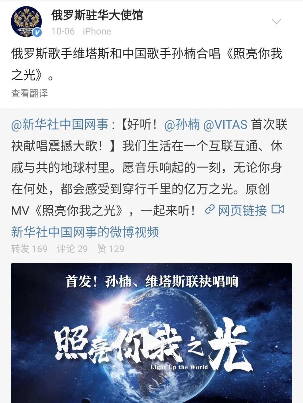 俄羅斯駐華大使館官方微博轉發(fā)
