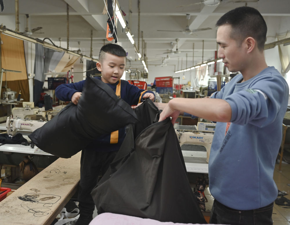 1月25日,張良國(guó)和妻子黃遠(yuǎn)玲一起加工防水包。