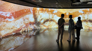4月11日,工人在山海关中国长城博物馆展厅察看灯光效果。