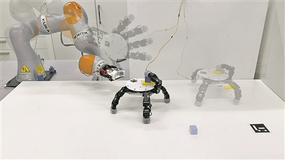 “巧手机器人”可从机械臂上分离,爬行拾取多个物体并重新与机械臂连接。