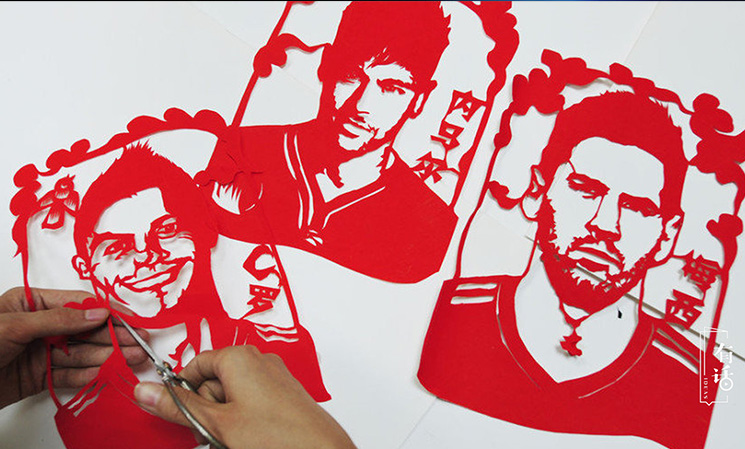 我之前剪過的民俗剪紙作品,像《白蛇傳》、《七月七鵲橋會(huì)》、《夜哭郎》等等,這些題材承載的是我們的傳統(tǒng)。但這些較為傳統(tǒng)的剪紙受眾并不多,所以我認(rèn)為青年人要有新的創(chuàng)新,加入現(xiàn)代社會(huì)中許多時(shí)尚前衛(wèi)的元素,這樣才能獲得更多人的喜愛。在2014年世界杯的時(shí)候,我就試著剪“世界杯剪紙”,梅西、C羅、內(nèi)馬爾,讓一些球星躍然紙上,讓熱愛足球的年輕人去關(guān)注、了解到傳統(tǒng)的剪紙藝術(shù)。2015年是世界反法西斯戰(zhàn)爭勝利70周年,我看到關(guān)于戰(zhàn)爭的一些資料圖片后,就創(chuàng)作了一幅《南京大屠殺》剪紙。畫面中運(yùn)用了黃色、紅色、黑色表現(xiàn)土地、火焰還有憤怒,這些都是用剪紙來表達(dá)我心中的感受。我的工作室現(xiàn)在也會(huì)做一些時(shí)尚的婚紗照剪紙,還有生日剪紙等,把這些傳統(tǒng)吉祥的寓意融入到現(xiàn)代人們的需求、裝飾和禮物中。