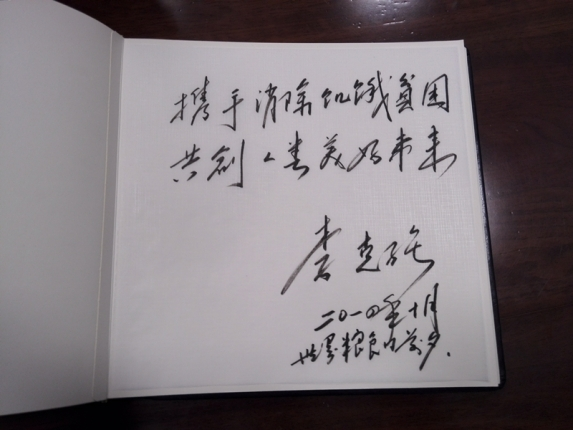 ????石板前面擺放著一張簽字桌,桌上放著一本叫做golden book(金書)的簽到簿,是專供到訪的國(guó)家領(lǐng)導(dǎo)人用的??藦?qiáng)總理在上面寫下了這樣一句話“攜手消除饑餓貧困 共創(chuàng)人類美好未來(lái)”。