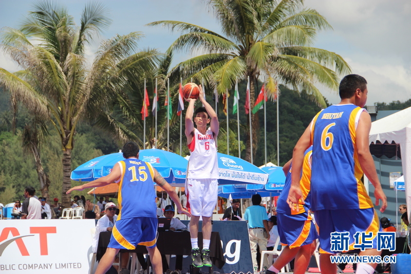 ??? 11月16日,中國沙灘籃球運動員劉洺宇(中)在比賽中。中國體育代表團16日在泰國普吉舉行的第四屆亞洲沙灘運動會上勇奪2枚金牌和2枚銅牌。當天比賽全部結束時,中國隊以3金2銀5銅的成績暫列獎牌榜第五。新華社發(fā)(塔納攝)