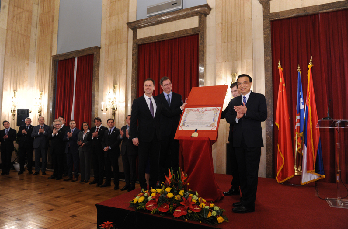 李克強(qiáng)被授予貝爾格萊德榮譽(yù)市民。新華社 饒愛(ài)民 攝