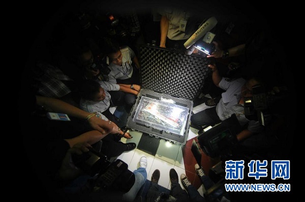 ??? 1月12日,在印度尼西亞雅加達(dá),工作人員打開裝有亞航失事客機(jī)黑匣子的箱子。印度尼西亞國家交通安全委員會主席塔唐·庫爾尼亞迪12日說,搜救人員當(dāng)天早上打撈起的失事亞航客機(jī)其中一個(gè)黑匣子——飛行數(shù)據(jù)記錄器狀態(tài)良好。新華社發(fā)(阿貢攝)