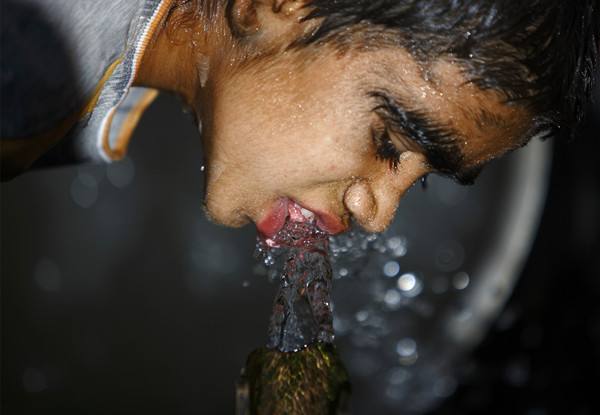 ↑2013年9月14日,在尼泊爾多爾克哈地區(qū),一名12歲的男孩在喝水。(新華社/路透)