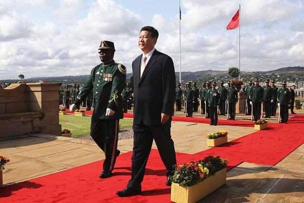 2013年3月26日,南非總統(tǒng)祖馬在比勒陀利亞聯(lián)邦大廈前廣場(chǎng)舉行儀式,歡迎中國(guó)國(guó)家主席習(xí)近平訪問南非。( 新華社記者蘭紅光攝)