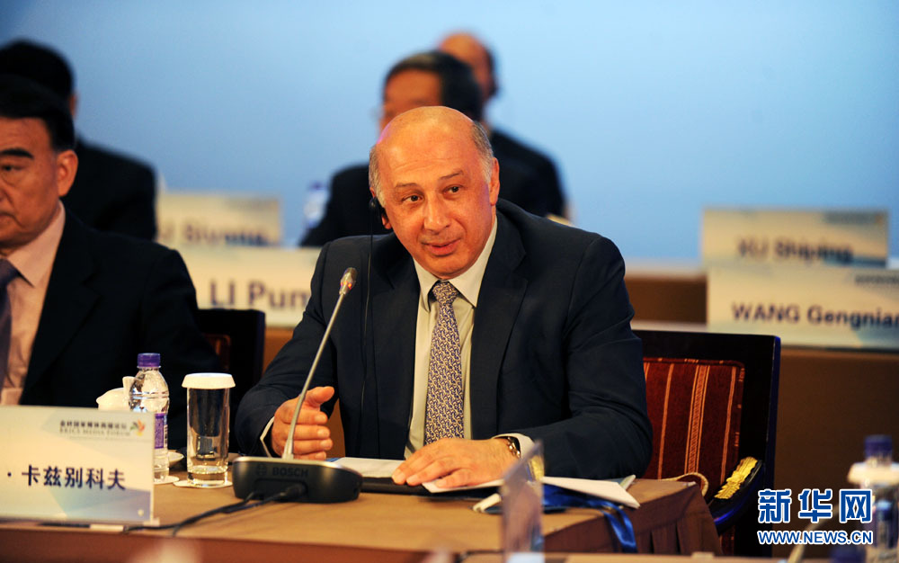 金磚國家媒體高端論壇開幕式6月8日在北京舉行。圖為金磚國家新開發(fā)銀行副行長卡茲別科夫致辭。 新華網 孫韜 攝