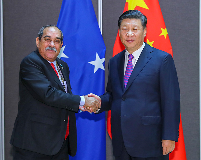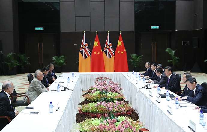11月16日,國(guó)家主席習(xí)近平在莫爾茲比港分別會(huì)見(jiàn)建交太平洋島國(guó)領(lǐng)導(dǎo)人。這是習(xí)近平會(huì)見(jiàn)紐埃總理塔拉吉。新華社記者 丁林 攝