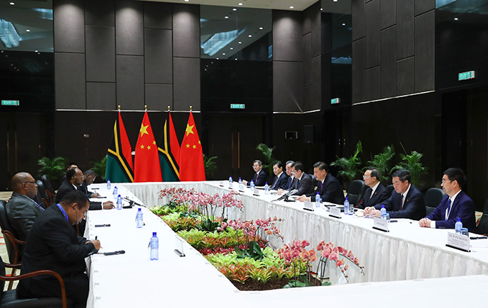 11月16日,國(guó)家主席習(xí)近平在莫爾茲比港分別會(huì)見(jiàn)建交太平洋島國(guó)領(lǐng)導(dǎo)人。這是習(xí)近平會(huì)見(jiàn)瓦努阿圖總理薩爾瓦伊。新華社記者 謝環(huán)馳 攝