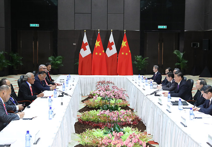 11月16日,國(guó)家主席習(xí)近平在莫爾茲比港分別會(huì)見(jiàn)建交太平洋島國(guó)領(lǐng)導(dǎo)人。這是習(xí)近平會(huì)見(jiàn)湯加首相波希瓦。新華社記者 丁林 攝