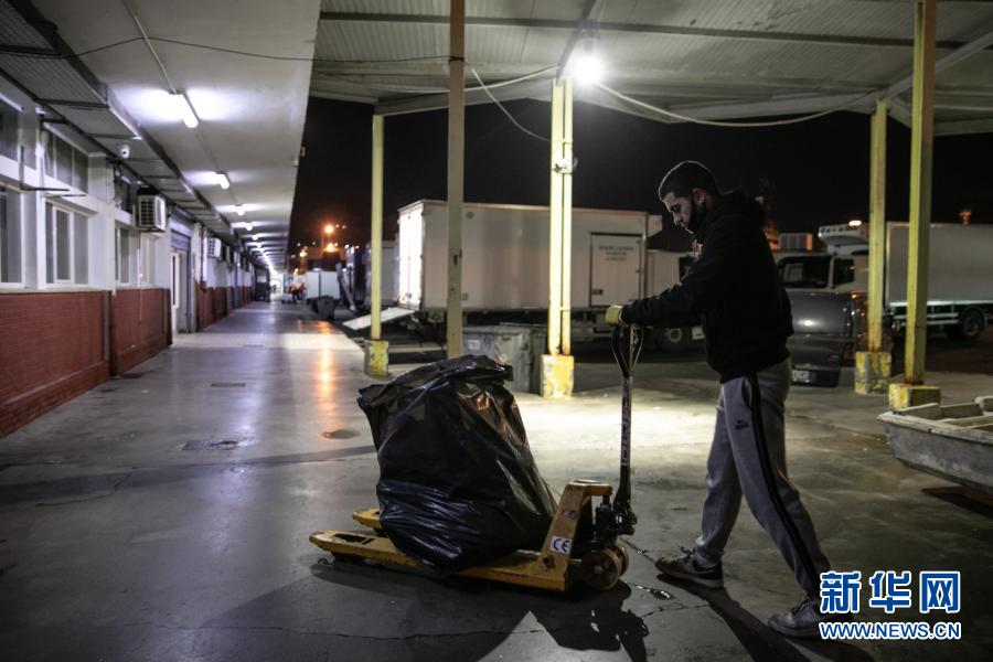 12月17日,在希臘比雷埃夫斯地區(qū)一處港口,阿拉帕基斯(右)與同事一同收集剛從漁船上卸下的塑料垃圾。新華社發(fā)(萊夫特里斯·帕察里斯攝)