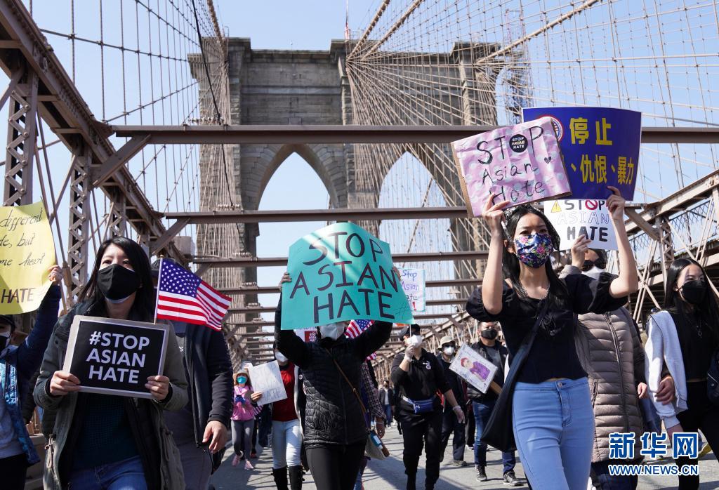 2021年4月4日,反對亞裔仇恨的游行隊(duì)伍走過美國紐約的布魯克林大橋。2020年以來,由于少數(shù)美國政客借疫情污名化亞裔,致使針對亞裔的種族歧視和仇恨犯罪不斷升級。 新華社記者 王迎 攝