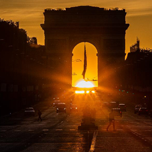 這是5月8日在法國(guó)巴黎香榭麗舍大街拍攝的凱旋門(mén)落日景象。